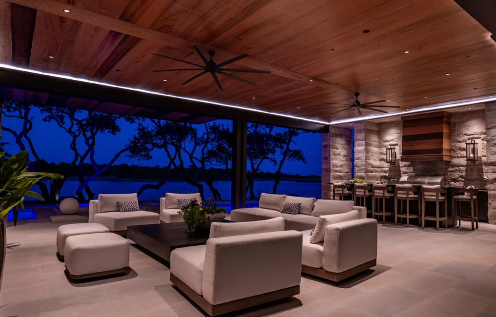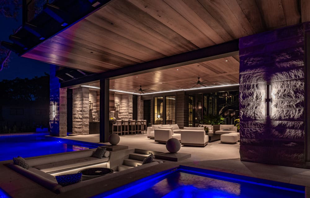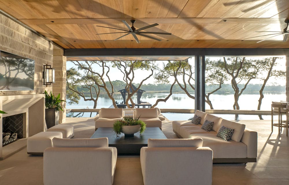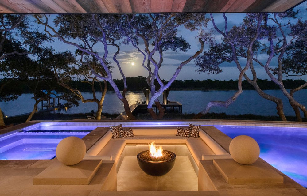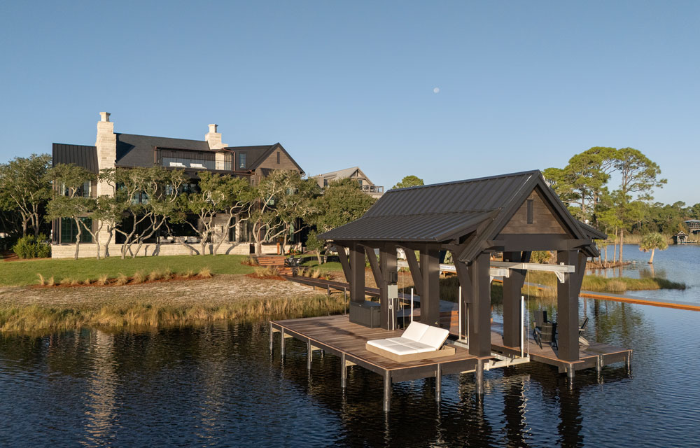 Just steps beyond, a saltwater pool and putting green set a resort-style tone, while a private boardwalk leads to an expansive, custom-designed boat dock that beautifully complements the home’s exterior architecture.